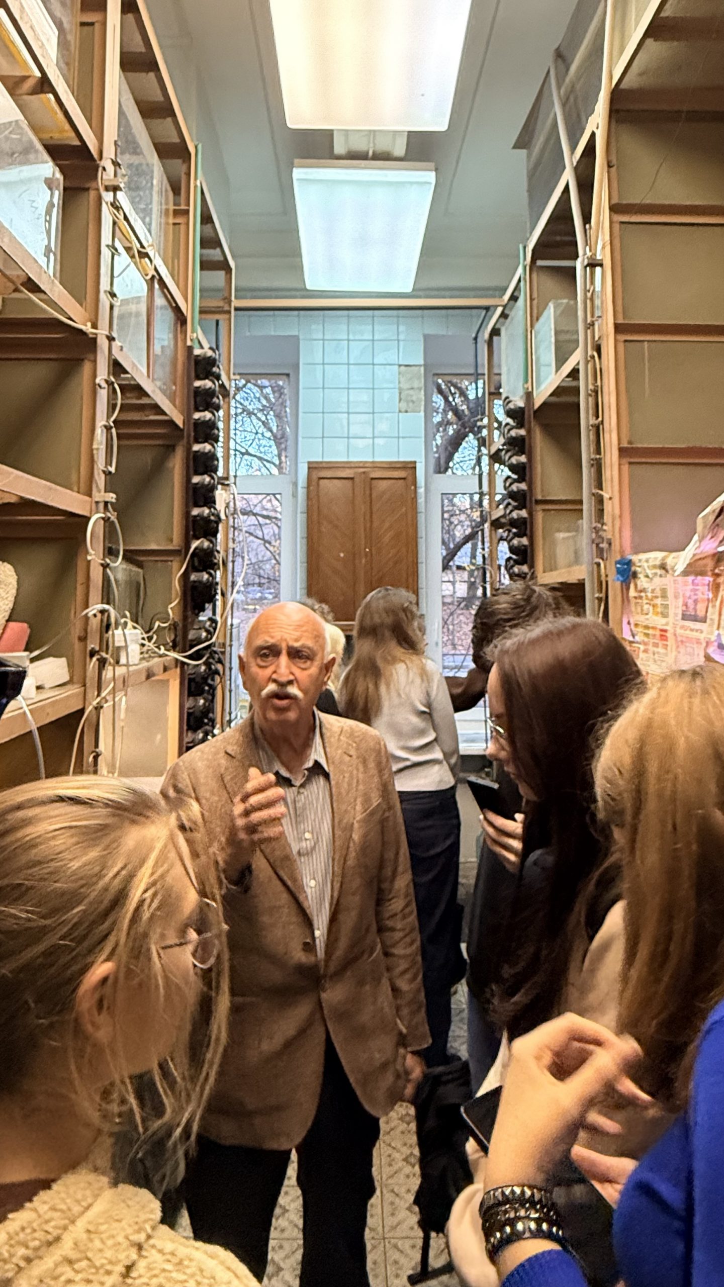 Заведующий кафедрой А.О. Касумян коротко познакомил студентов с разнообразием рыб, с особенностями их жизни, морфологии, физиологии, поведения и сенсорных систем, о структуре кафедры, преподавателях и работающих здесь сотрудниках, об основных направлениях научных исследований, местах экспедиционных поездок и объектах изучения. Студентам было рассказано,какие лекционные спецкурсы и практикумы осваивают обучающиеся на кафедре студенты, где проходят летние полевые практики, какие темы выпускных квалификационных работ выполняют студенты-ихтиологии и в каких научных и образовательных организациях наши выпускники работают после окончания обучения. Все желающие посетили аквариумную комнату нашей кафедры, где содержатся рыбы, которые используются или будут использованы для различных экспериментов.